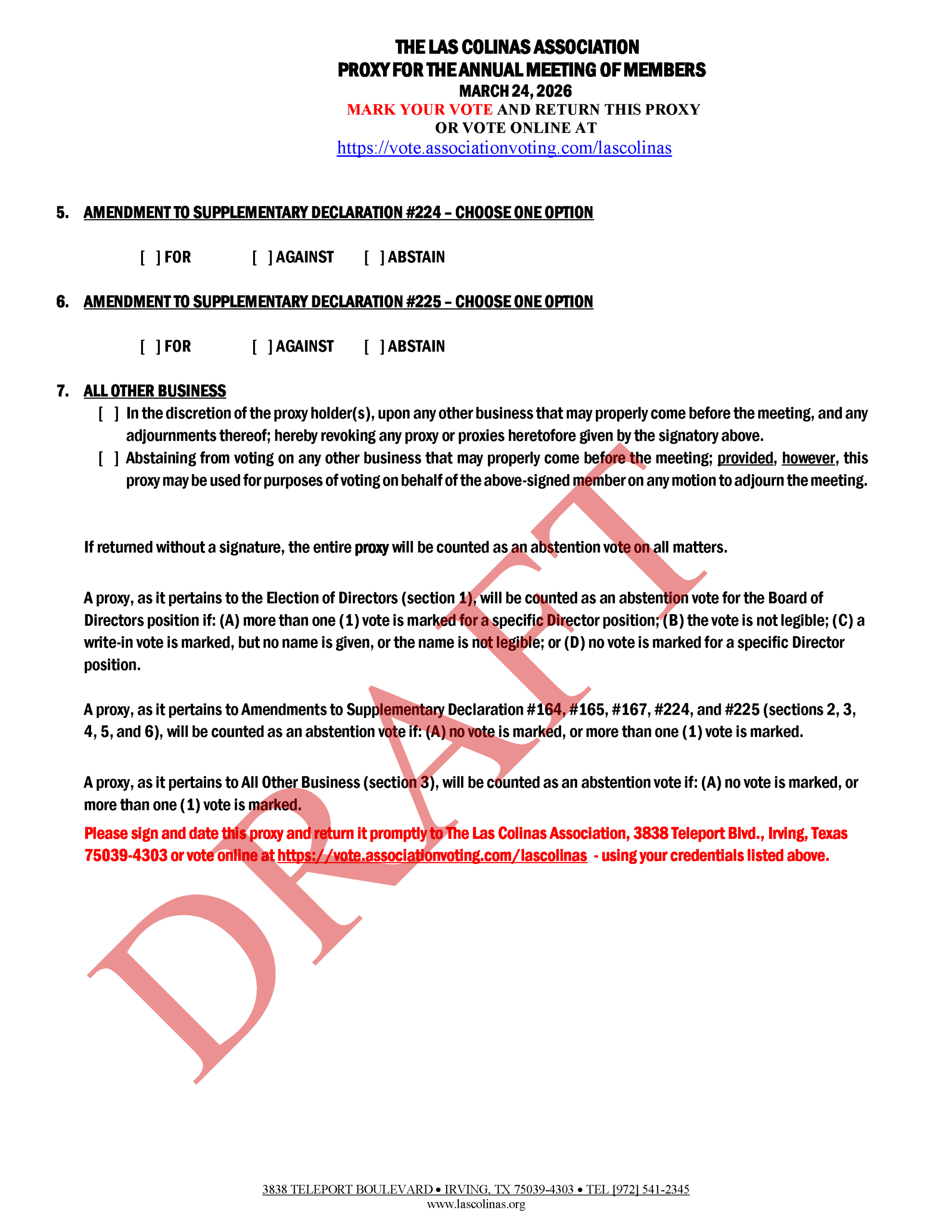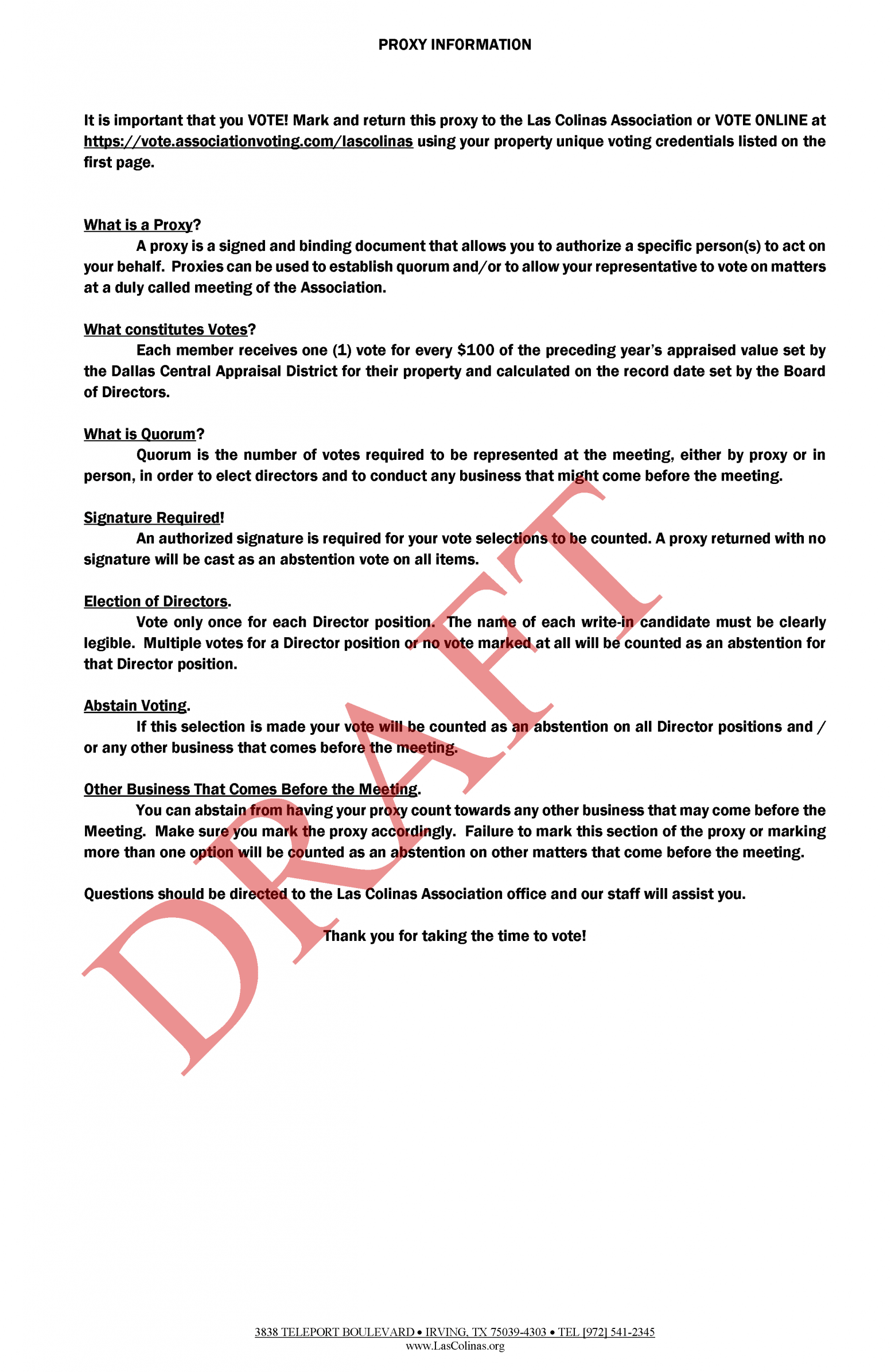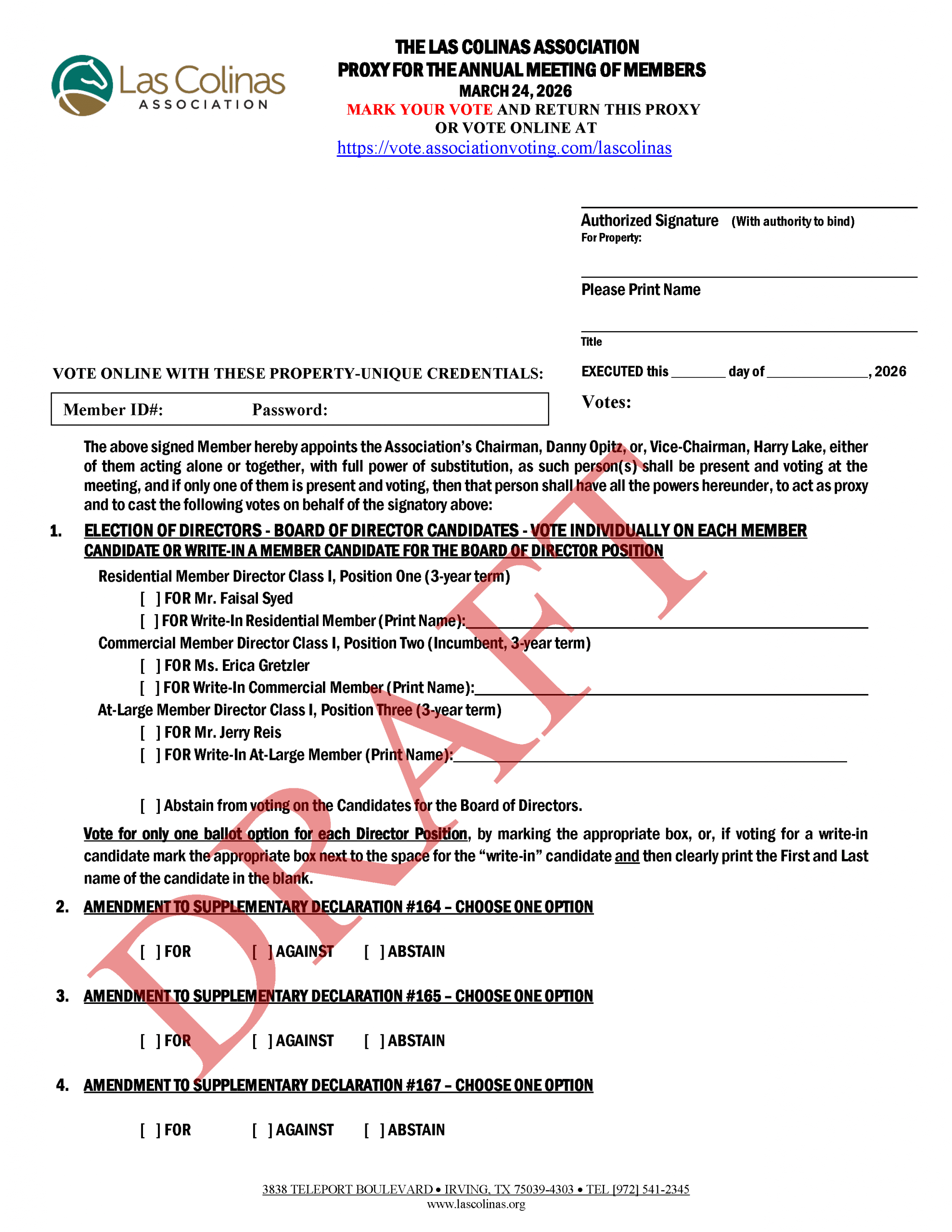 You can also submit your vote online at vote.associationvoting.com/lascolinas using the credentials included on the proxy.