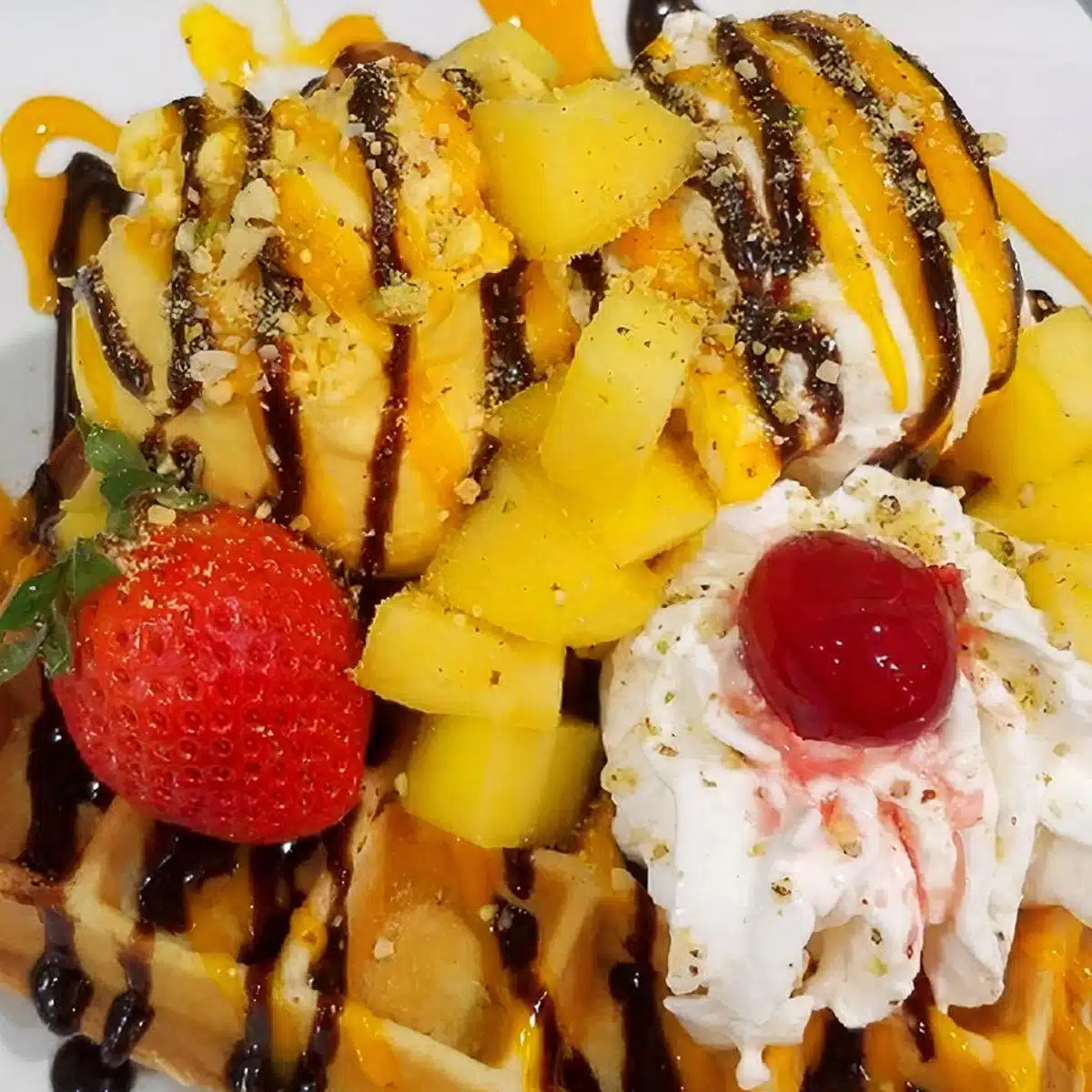 Staff favorite: Mango Mania Waffle: Fresh mango, whipped cream, mango ice cream, chocolate syrup, mango syrup and powdered sugar