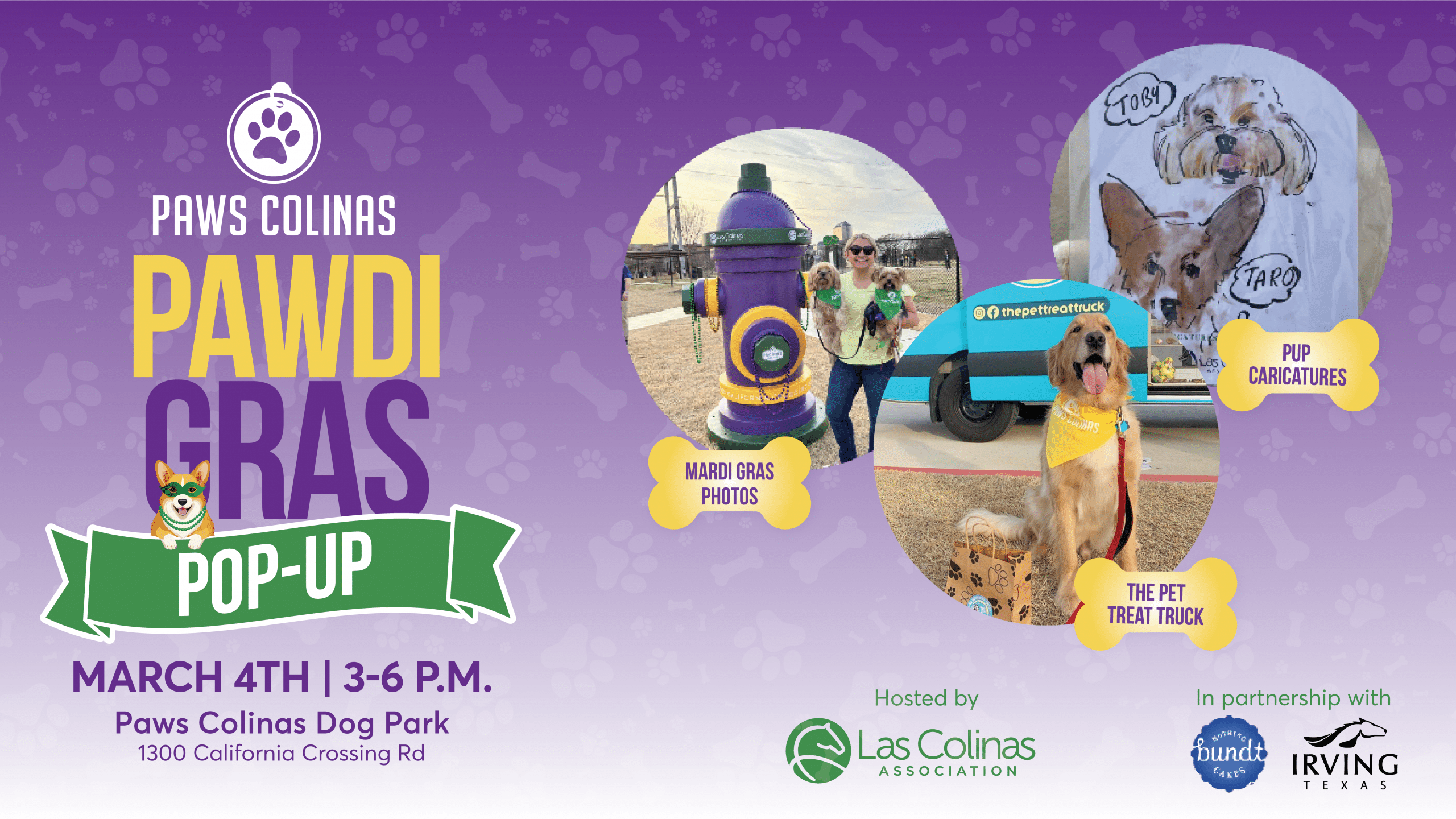Join us for a paw-some Mardi Gras celebration with your furry friend at the Paws Colinas dog park. Save the date for Pawdi Gras, hosted by the Las Colinas Association, on March 4th from 3 to 6 p.m.